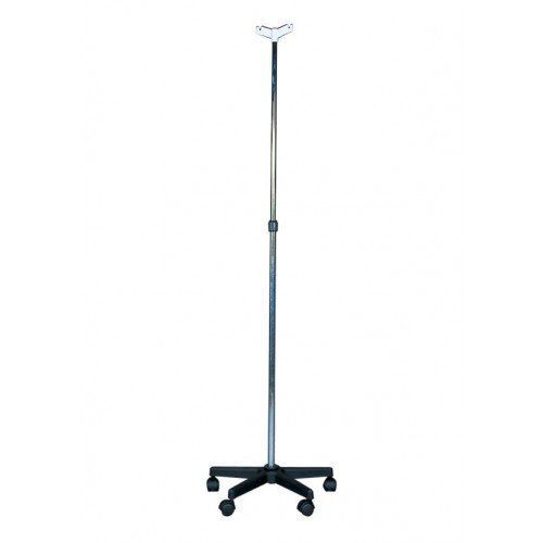 Asta porta-flebo con base in plastica nera a cinque razze su ruote piroettanti. Struttura in tubolare di acciaio cromato. Regolabile in altezza grazie all’apposita manopola. Corredata di doppio gancio porta-flebo.