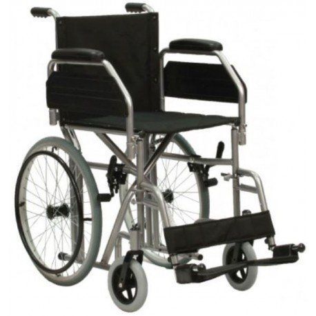 Carrozzina pieghevole. Struttura in acciaio verniciato. Fianchi ribaltabili, pedane estraibili. Ruote Posteriori 24” in PU a estrazione rapida