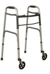 Deambulatore con struttura tubolare in alluminio anodizzato dotato di due ruote e due puntali, pieghevole e regolabile in altezza