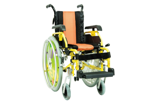 Carrozzina ad autospinta da bambino leggera e pieghevole, in alluminio verniciato, maniglie di spinta regolabili in altezza.